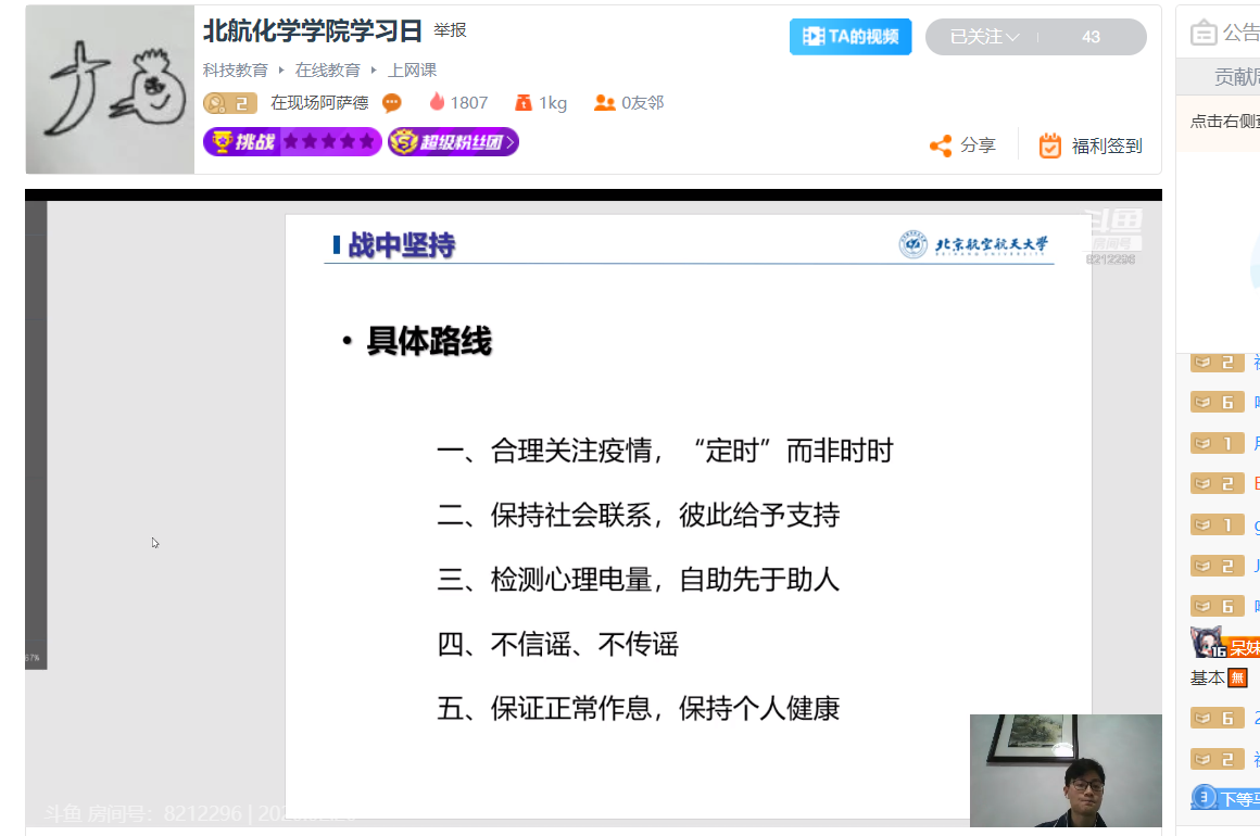 2月26日,beat365官方网站全体本科生、研究生开展“学习日”活动,主要内容为首日教育以及疫情防控知识学习,通过线上直播讲解和视频播放方式进行。学习日活动由各年级辅导员主持。