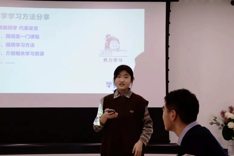 最后,聂导给大家带来《启航学堂》中的“我的大学学习”相关内容。《启航学堂》上,结合期中考试,班上两位单科分数最高的同学任姿璇和丛明昊和大家分享了他们的学习方法,接着聂导给大家介绍了时间管理和压力调节的几种经典理论。最后聂导表示,希望大家通过今天的学习沙龙,能够认真分析过去两个月的学习中出现的问题,从别人的分享中有所收获,并针对自己的实际学习情况制定接下来的计划,努力为期末考试做好准备。