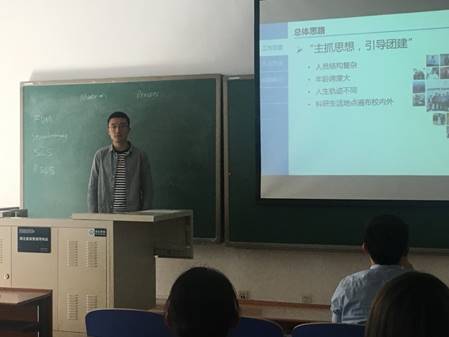 首先,学院2018级研究生辅导员赵赫对这次会议的目的和内容做了说明。其次,化学学院17级硕士班班长刘海建对学生干部应有的能力以及在开展的学生工作中应注意的方式做出了中肯的建议。随后,物理学院17级硕士党支部书记王猛讲述了对高校党支部的定位、学生支部书记的定位,并传授了对于工作中常见困难的解决办法。最后,生医学院17级博士班班长刘博伦从三方面详细介绍、展示了他的工作经验和成果。他指出:在工作思路上,要主抓思想,引导团建;从而达到让班集体同学相互了解相互协作的目的。在方式方法上,要将思想建设与活动组织并进,才能更好的开展工作。做学生干部,不仅要摆正位置、调整心态、积极主动地工作,还要寻找学生工作与自身科研之间的平衡。