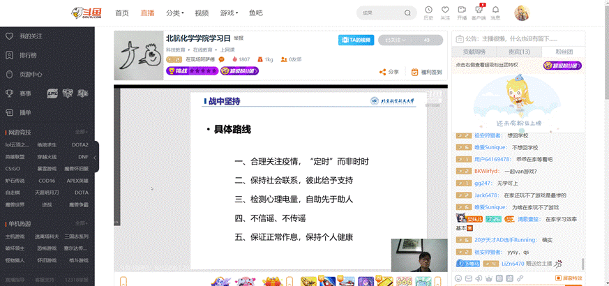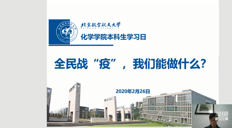 2月26日下午,beat365官方网站本科生2016级、2017级、2018级召开学习日活动,活动主题为“全民战‘疫’,我么能做什么?”,本次学习日活动采用线上班会的形式,由辅导员在斗鱼直播平台主讲开展。